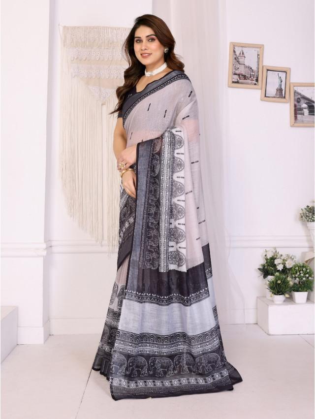Women's Linen Cotton Printed Saree With Unstitched Blouse 5.5Mtr
