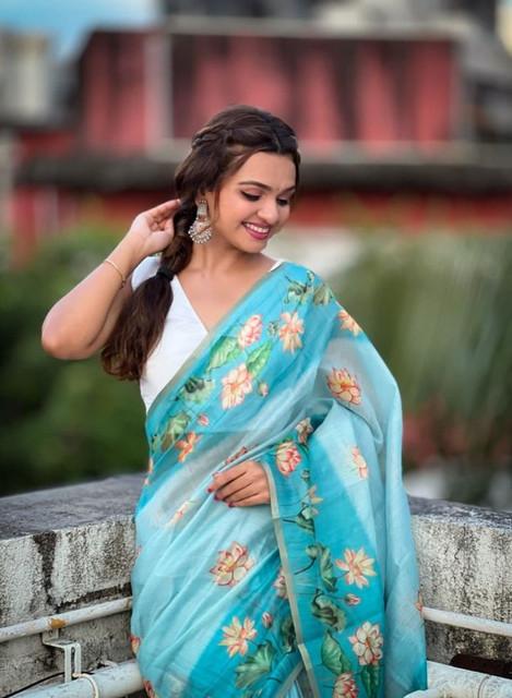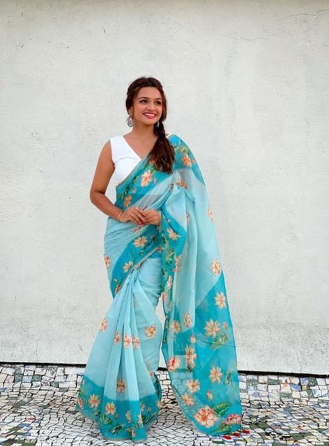 Women's Linen Printed Saree With Unstitched Blouse 5.5Mtr