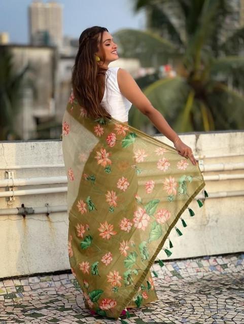 Women's Linen Printed Saree With Unstitched Blouse 5.5Mtr