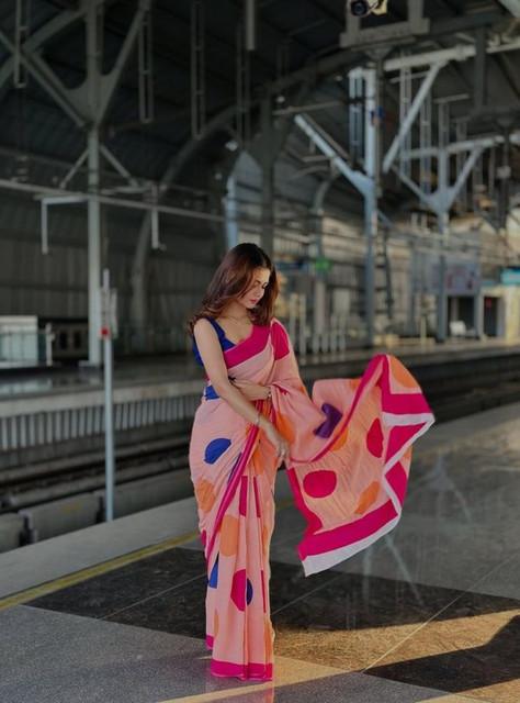 Women's Linen Printed Saree With Unstitched Blouse 5.5Mtr