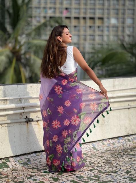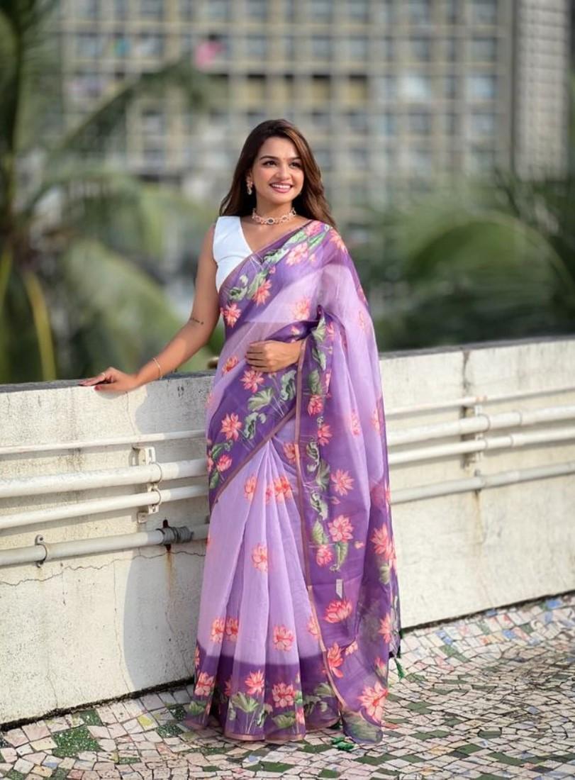 Generic Women's Linen Printed Saree With Unstitched Blouse 5.5Mtr (Purple)