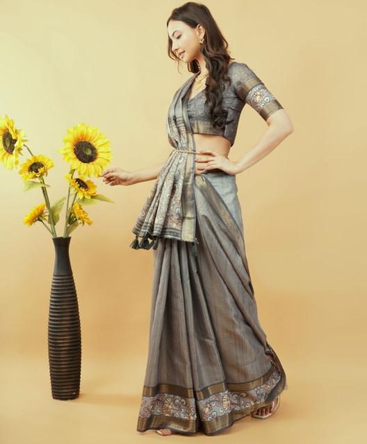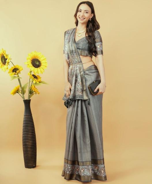 Generic Women's Polyester Printed Saree With Unstitched Blouse 5.5 Mtr (Grey)