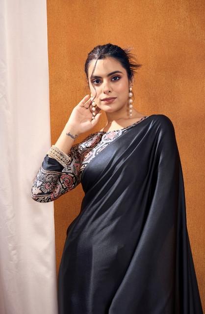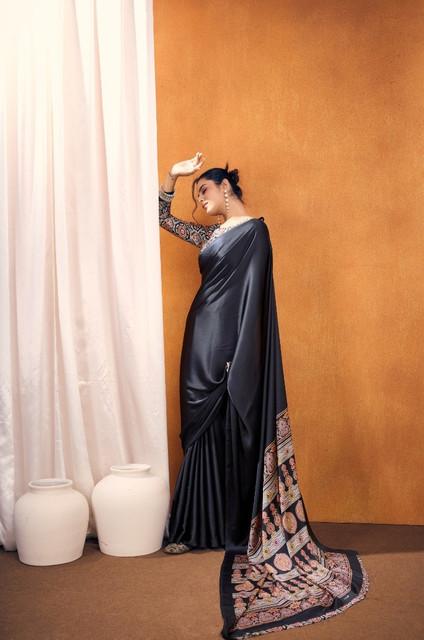 Women's Satin Crepe Printed Saree With Unstitched Blouse 5.5Mtr