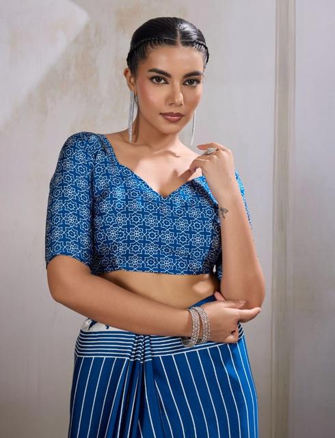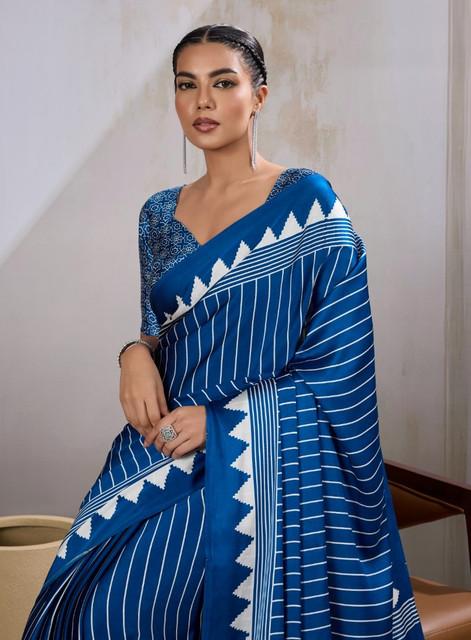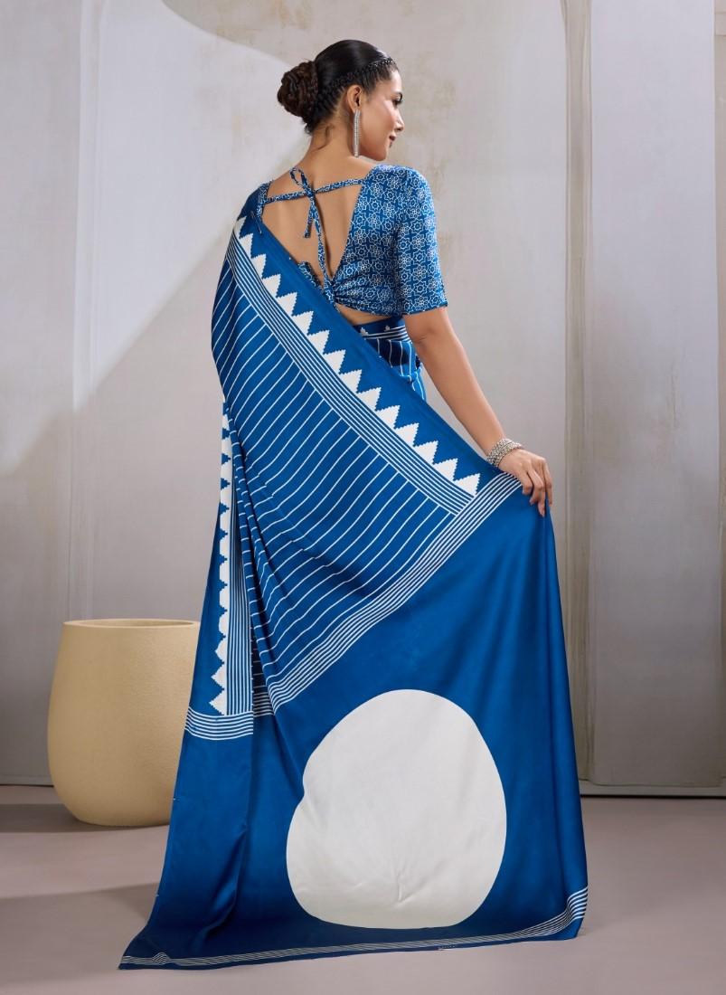 Generic Women's Satin Crepe Printed Saree With Unstitched Blouse 5.5Mtr (Blue)