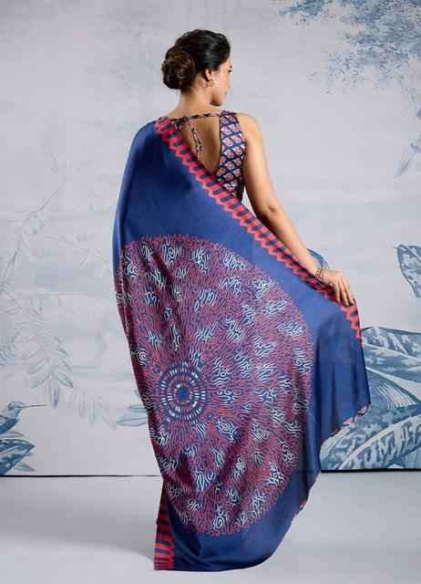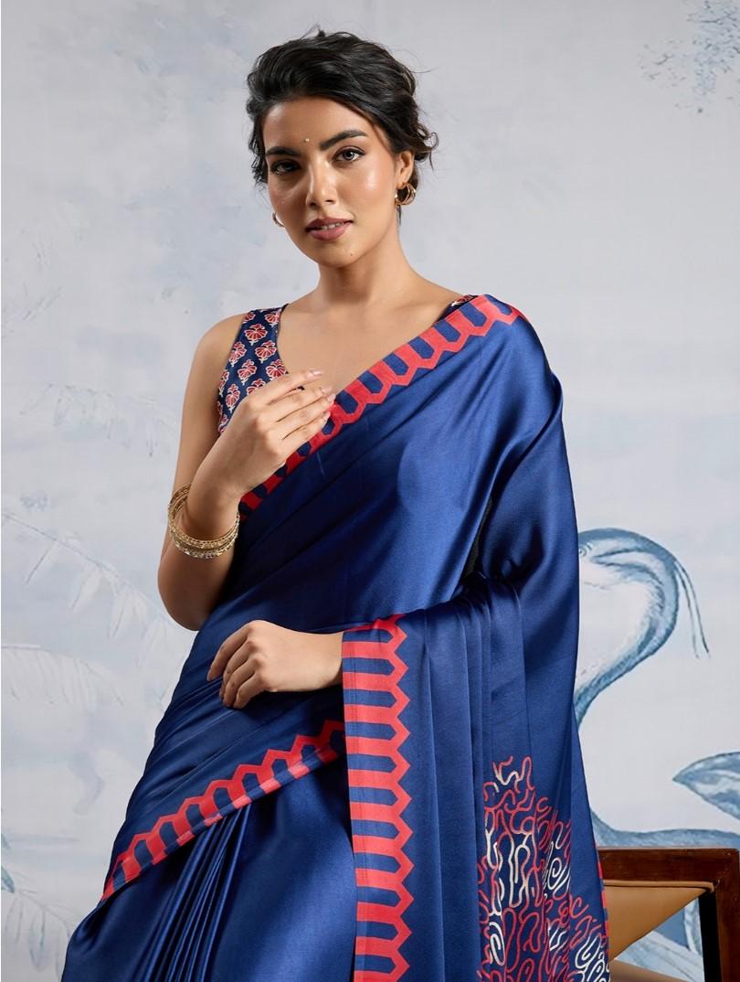 Generic Women's Satin Crepe Printed Saree With Unstitched Blouse 5.5Mtr (Blue)