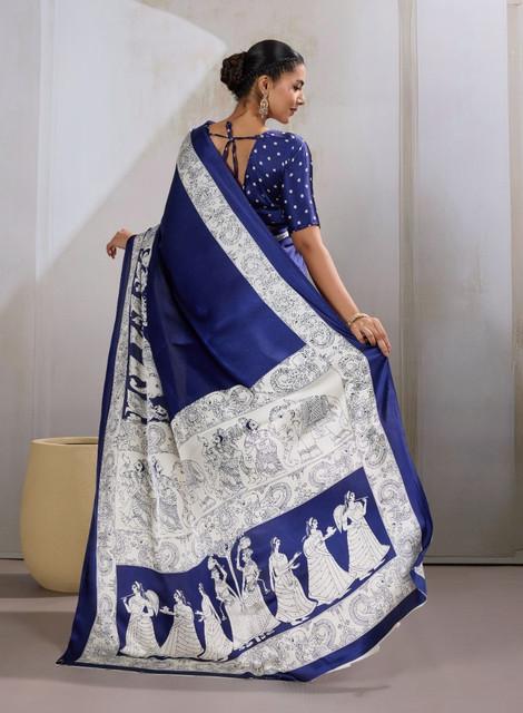 Generic Women's Satin Crepe Printed Saree With Unstitched Blouse 5.5Mtr (Blue)