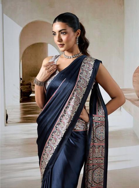 Generic Women's Satin Crepe Printed Saree With Unstitched Blouse 5.5Mtr (Navy Blue)