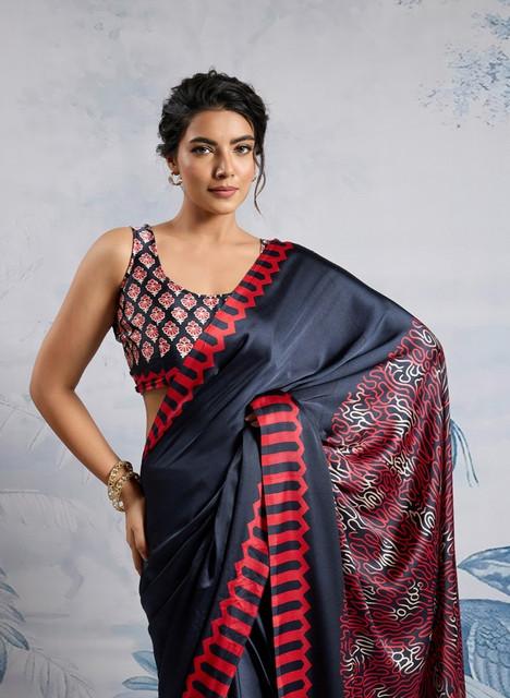 Generic Women's Satin Crepe Printed Saree With Unstitched Blouse 5.5Mtr (Navy Blue)