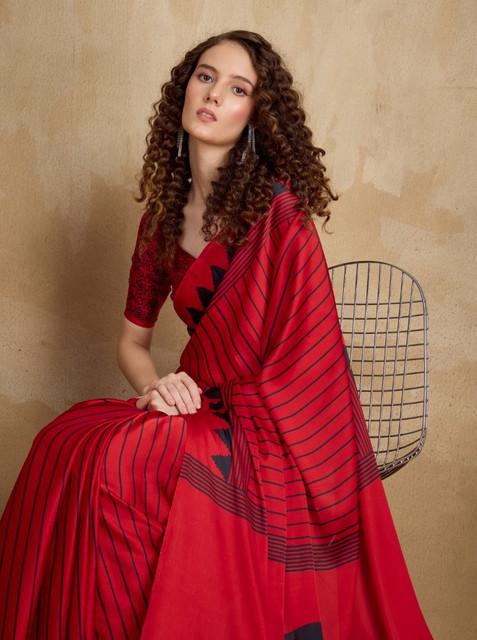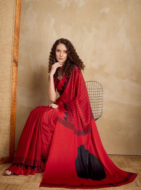 Generic Women's Satin Crepe Printed Saree With Unstitched Blouse 5.5Mtr (Red)