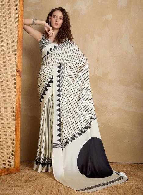 Generic Women's Satin Crepe Printed Saree With Unstitched Blouse 5.5Mtr (White)