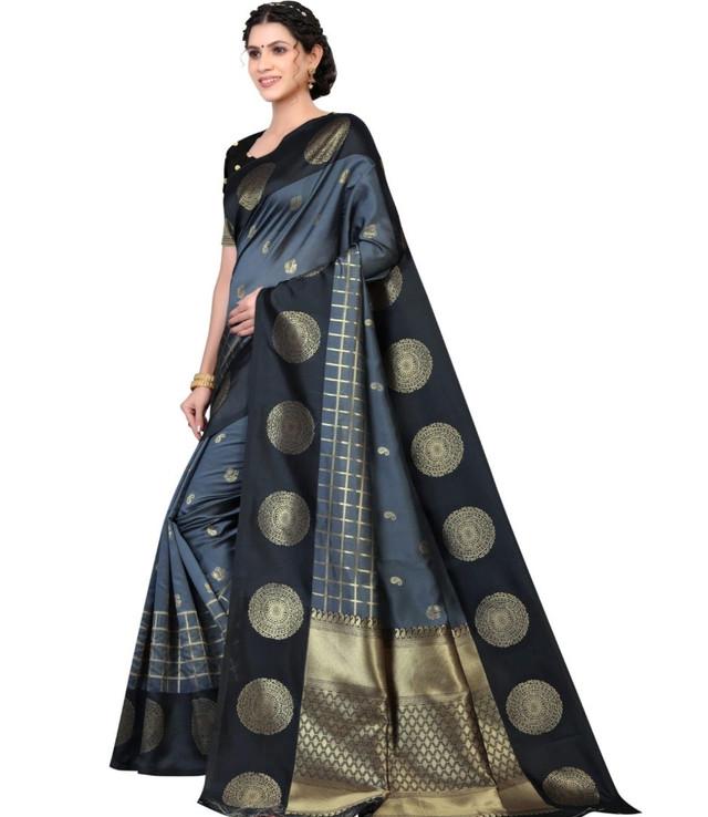 Generic Women's Soft Lichi Silk Printed Saree With Unstitched Blouse 5.5Mtr (Black)