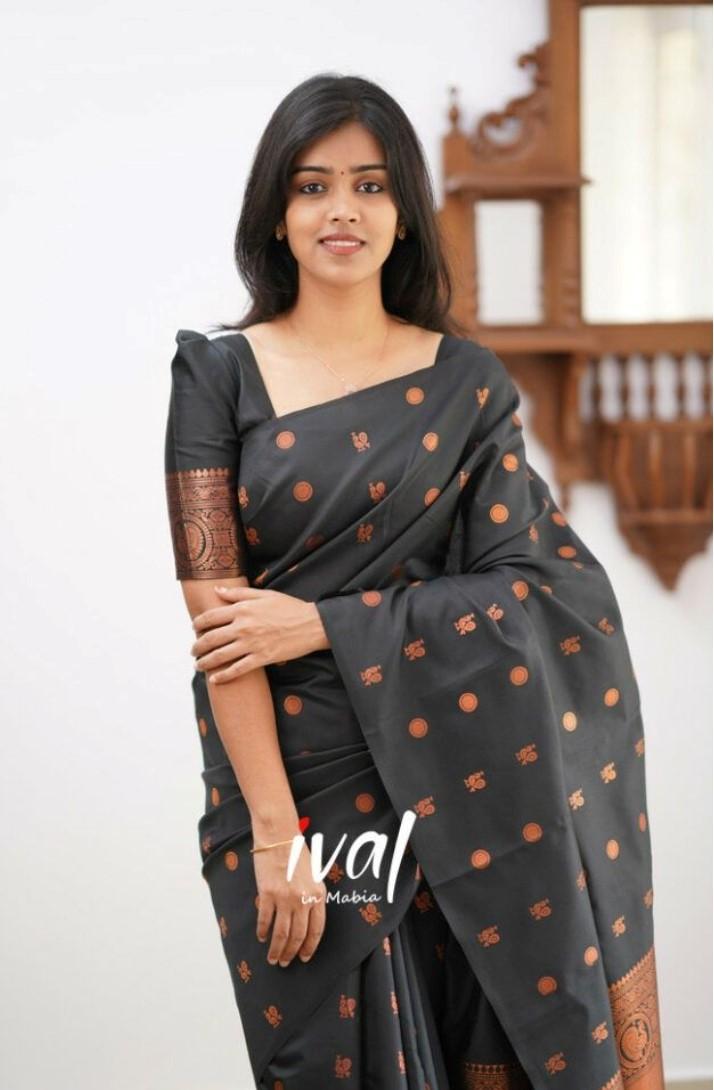 Generic Women's Soft Lichi Silk Printed Saree With Unstitched Blouse 5.5Mtr (Black)