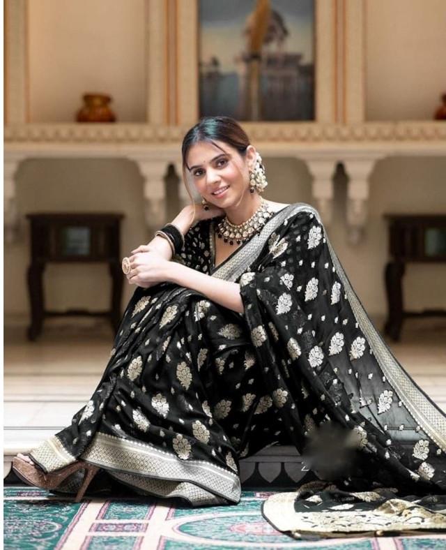 Generic Women's Soft Lichi Silk Printed Saree With Unstitched Blouse 5.5Mtr (Black)