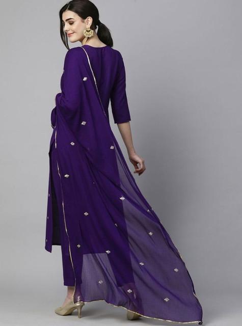 Generic Women's Tesla Silk Embroidered U-Neck Kurti With Pant Dupatta Set (Dark Purple)